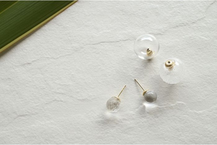 ガラスのバックキャッチが後ろ姿をキュートに見せてくれます。 ガラス大きさ:約Φ8・Φ15mm※ Φ15のガラスがバックキャッチ真鍮 本金メッキ