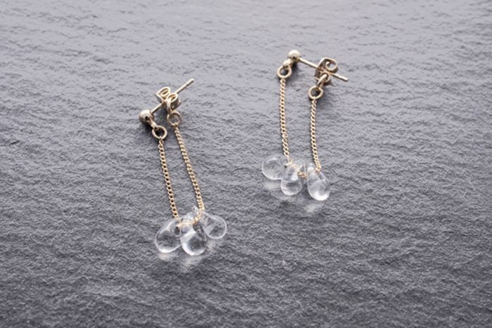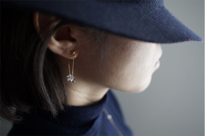 ピアスヘッドからキャッチまで、チェーンで繋がっています。立体的に見えるチェーンに通った、ガラスが煌めきます。 ガラス大きさ:約Φ4×6mmチェーン長さ:約45mm真鍮・丹銅 本金メッキ