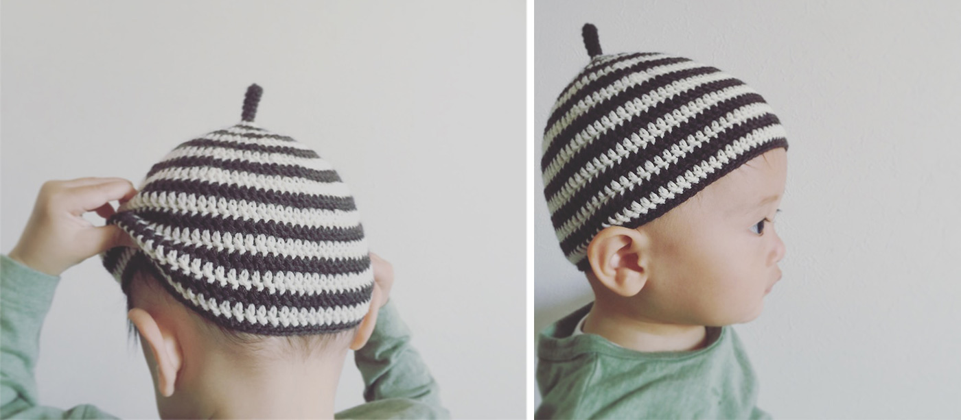 This acorn shaped knit cap that softly wraps around a small child's head instantly became the target of admiration by other mothers.